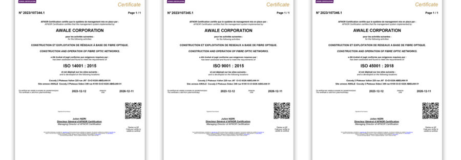 AWALE Corporation SA confirme avec succès le maintien de ses certifications ISO 9001:2015, ISO 14001:2015 et ISO 45001:2018 à l’issue de l’audit de suivi n°2 réalisé du 01 au 03 décembre 2025 par un auditeur mandaté par AFNOR Certification.